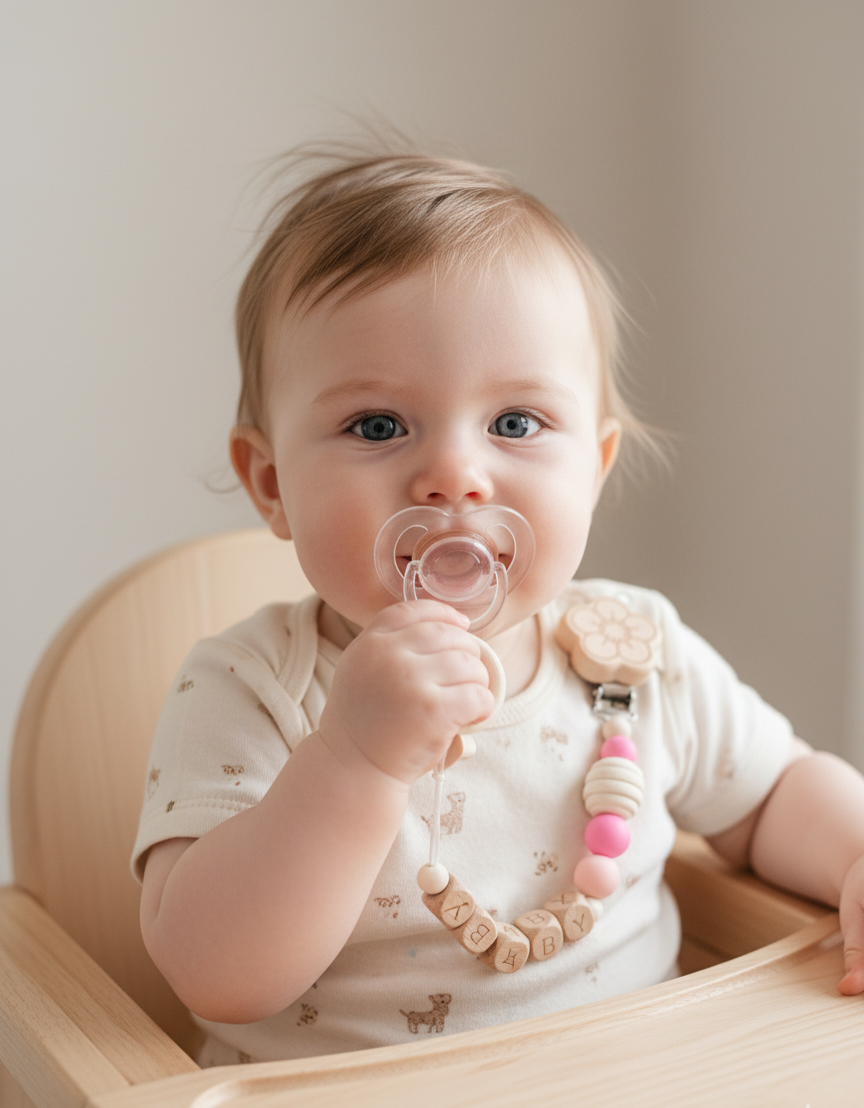 Choisissez cette magnifique et adorable attache sucette en bois et silicone alimentaire pour décorer le look de la tenue de votre bébé. Sans BPA, sans plomb, sans phtalates, sans latex et sans cadmium. Une qualité optimale pour votre enfant.